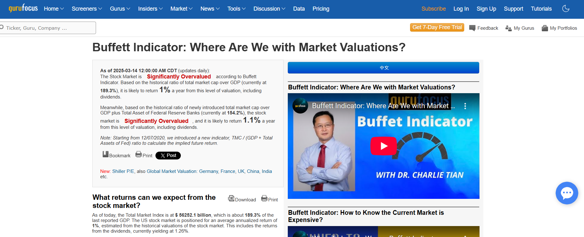 버핏 지수는 투자자들에게 주식 시장의 과열 여부를 판단하는 데 유용한 지표입니다. 이러한 버핏 지수를 확인할 수 있는 신뢰할 만한 사이트로는 GuruFocus가 있습니다.